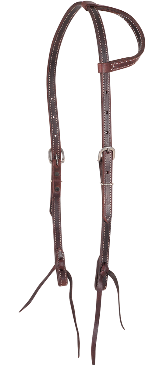 Bride à oreilles coulissantes avec boucles et attaches de mors en acier inoxydable. Cuir latigo doublé et cousu 5/8".