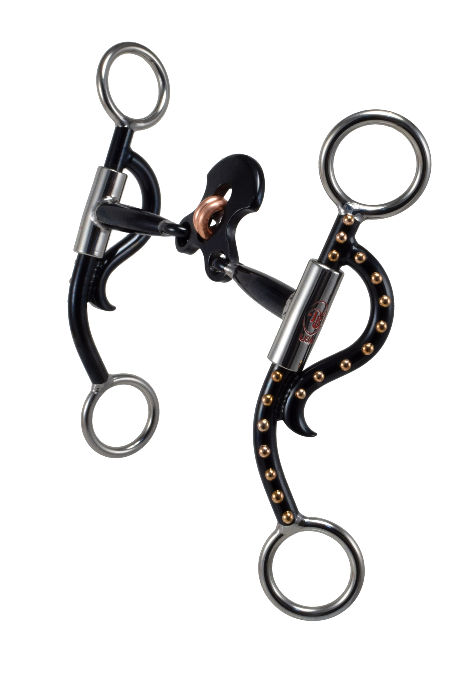 この美しく細工されたビットは、ドット付きの黒仕上げの Shorthorn© シャンクが特徴です。 マウスピースはダブルクロス©です。 このシャンクは6 3/4インチです。