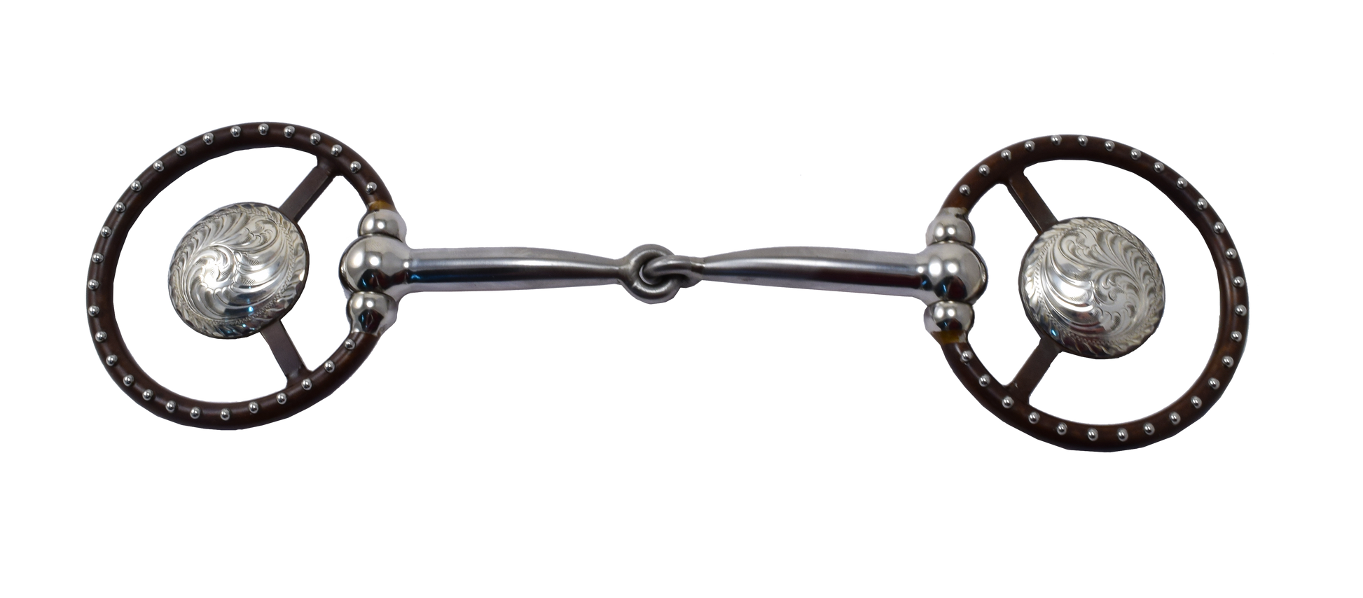 This beautifully crafted snaffle bit features a brown Ballhinge Ring© with dots and features an attractive hand-engraved silver concho. The mouthpiece is our Tom Balding Snaffle© with copper inlays. The standard mouthpiece width is 5 1/8" and the ring diameter is 5/16".