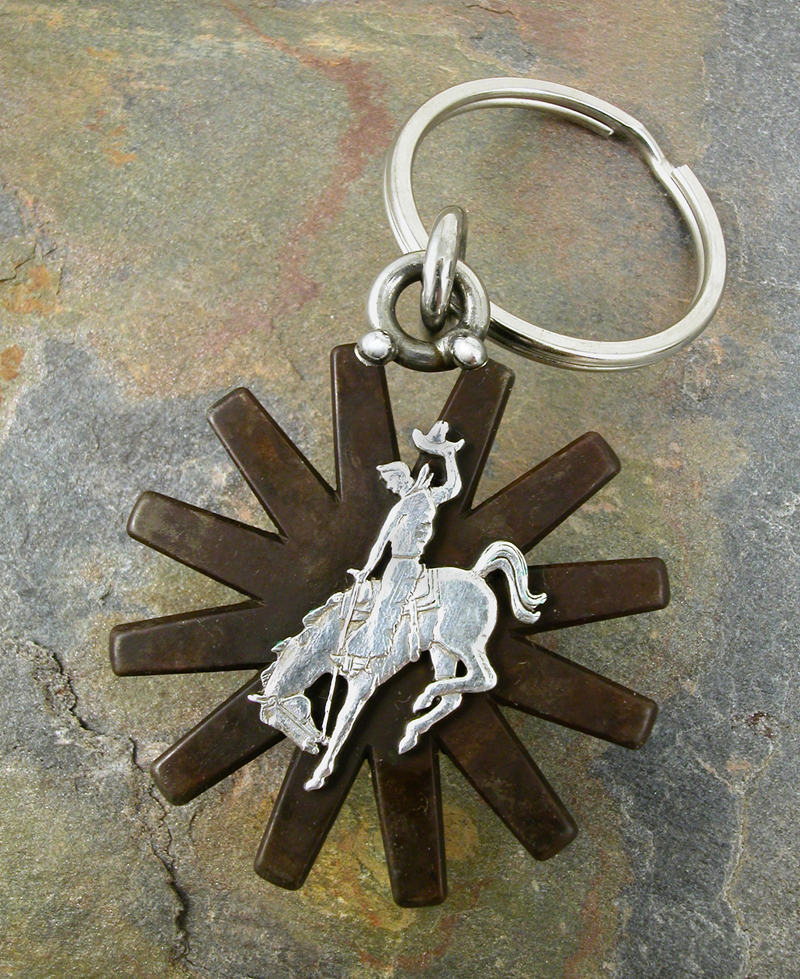 Each key chain rowel is an authentic spur rowel and is given the same attention to detail and craftsmanship. Add a little flare to your key ring with this Tom Balding signature rowel and sterling silver bucking horse. This rustic high quality brown finish is designed to accentuate the beautiful sterling silver work