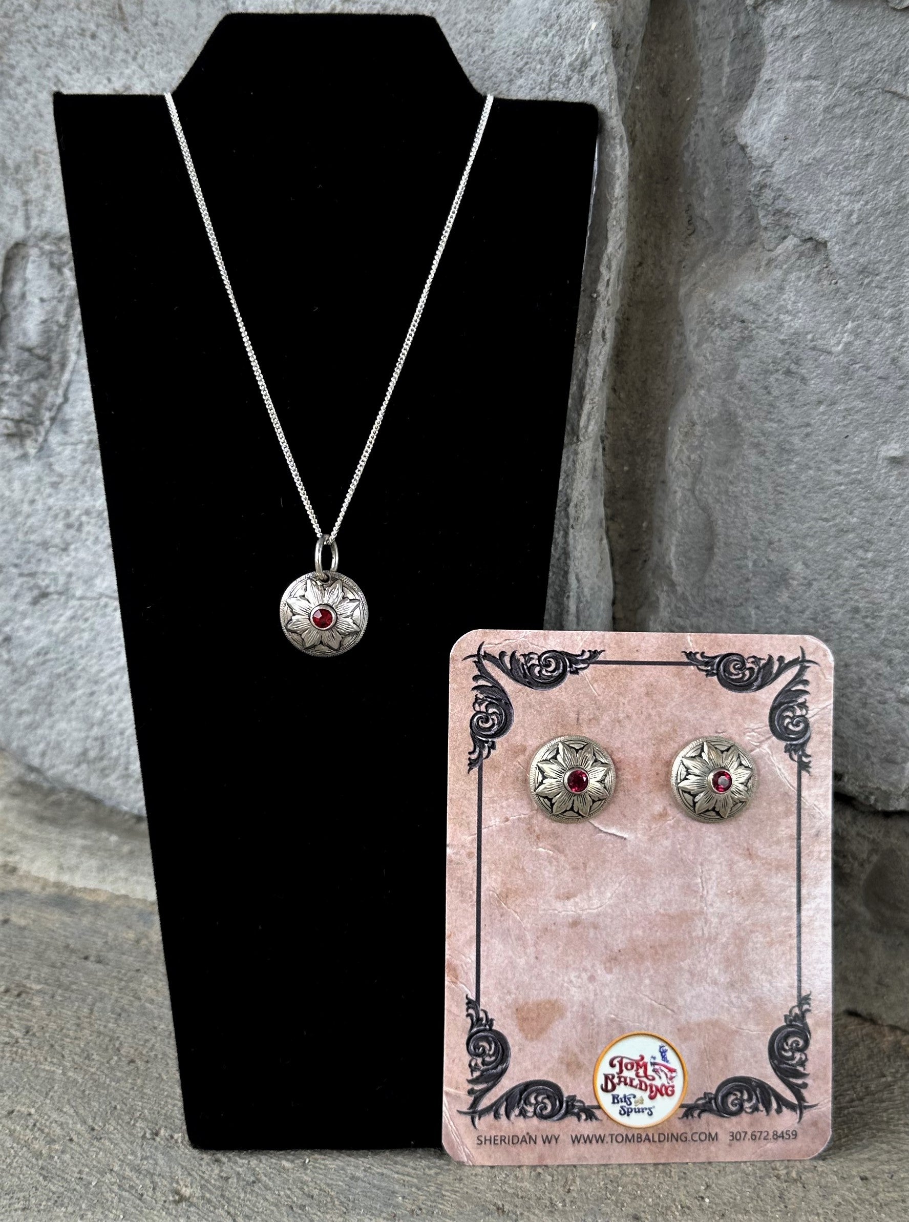 Classic Sterling Silver Flower Burst Concho Earrings or Pendant With Simulated Ruby $79.00