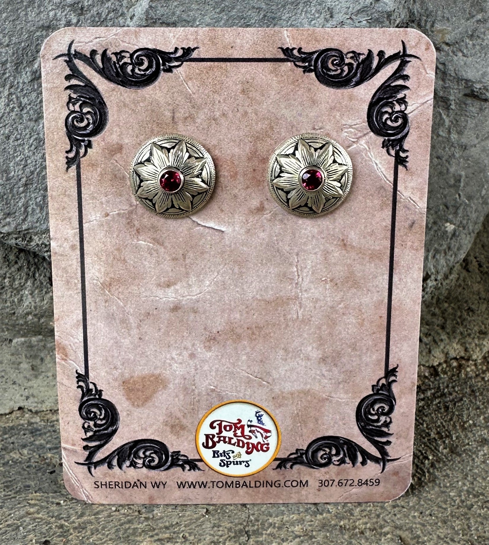 Each sterling silver concho earring is given great attention to detail and craftsmanship. Add a little flair to your wardrobe with this beautifully engraved concho featuring the classic flower burst pattern and inlaid simulated ruby.