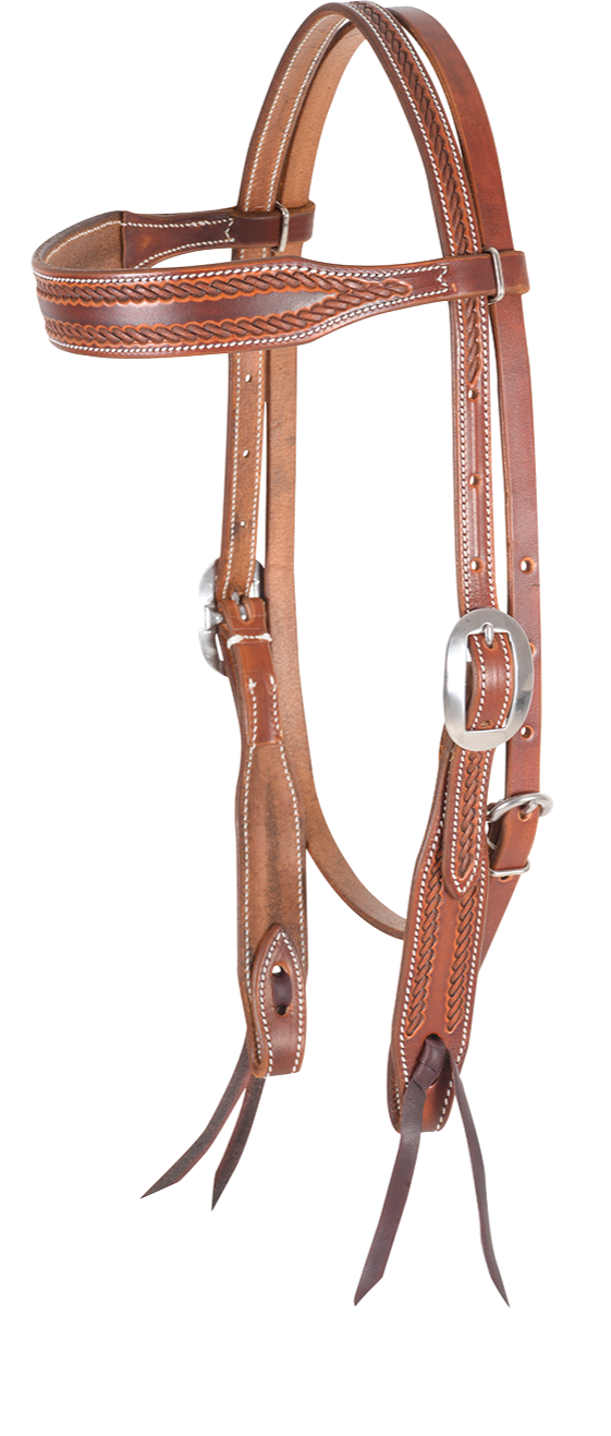 This high-quality headstall is a browband design with a Rope border, featuring cart buckles and latigo ties. It is made of Chestnut skirting Leather.