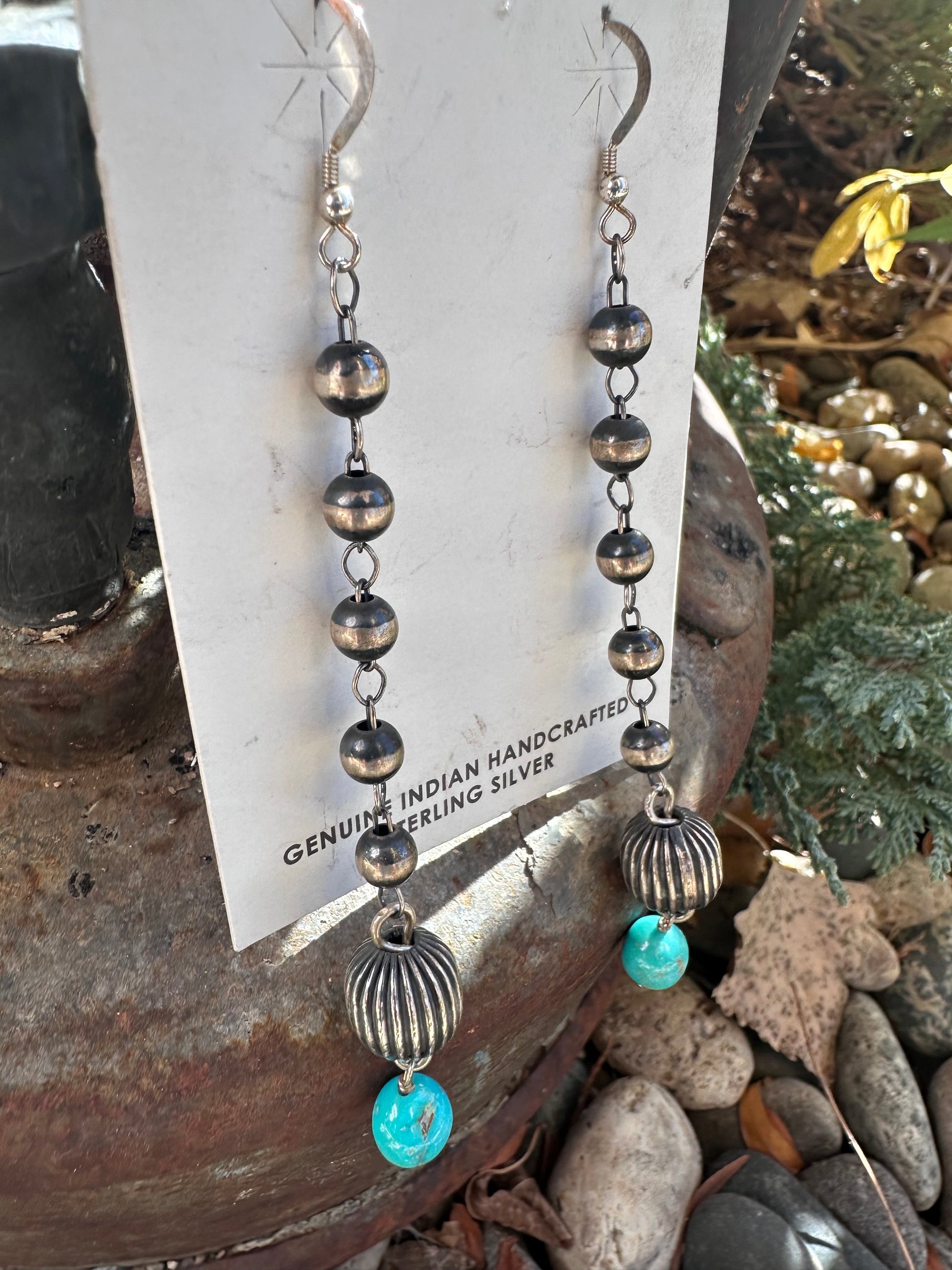 Add a touch of timeless Southwestern elegance with these handcrafted Navajo Pearl and Turquoise Bead Earrings. Made from sterling silver and genuine turquoise, each earring is a unique expression of Native American artistry and craftsmanship.