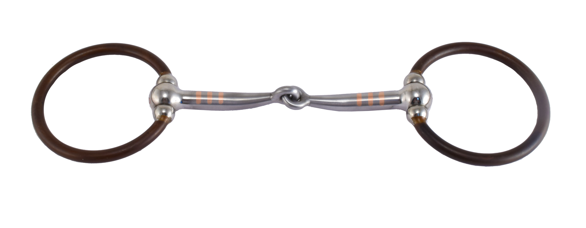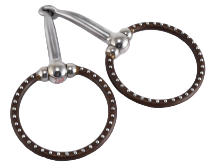 Este freio de freio lindamente trabalhado apresenta um Ballhinge Ring© marrom com pontos. O bocal é nosso Tom Balding Snaffle© com incrustações de cobre. A largura padrão do bocal é 5 1/8" e o diâmetro do anel é 5/16".