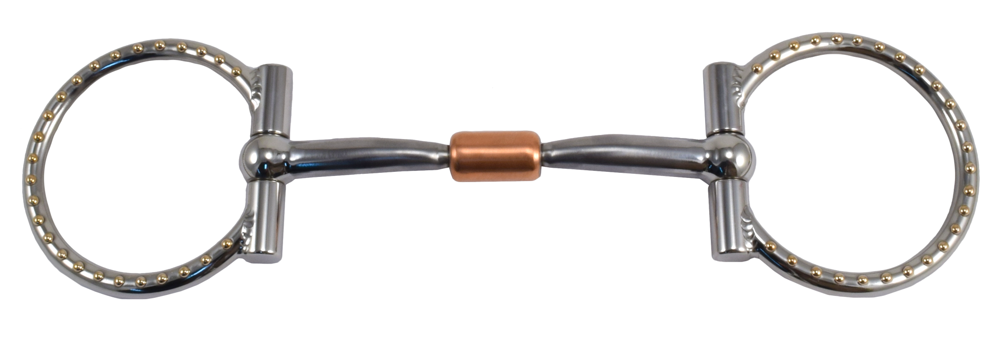 Este travão, lindamente trabalhado, apresenta uma dobradiça esférica em D-Ring© com acabamento em aço inoxidável e pontos em latão. O bocal é o nosso Tom Balding Billy Allen© feito de ferro doce e cobre. O bocal tem 5 1/8" e o diâmetro do anel é de 5/16".